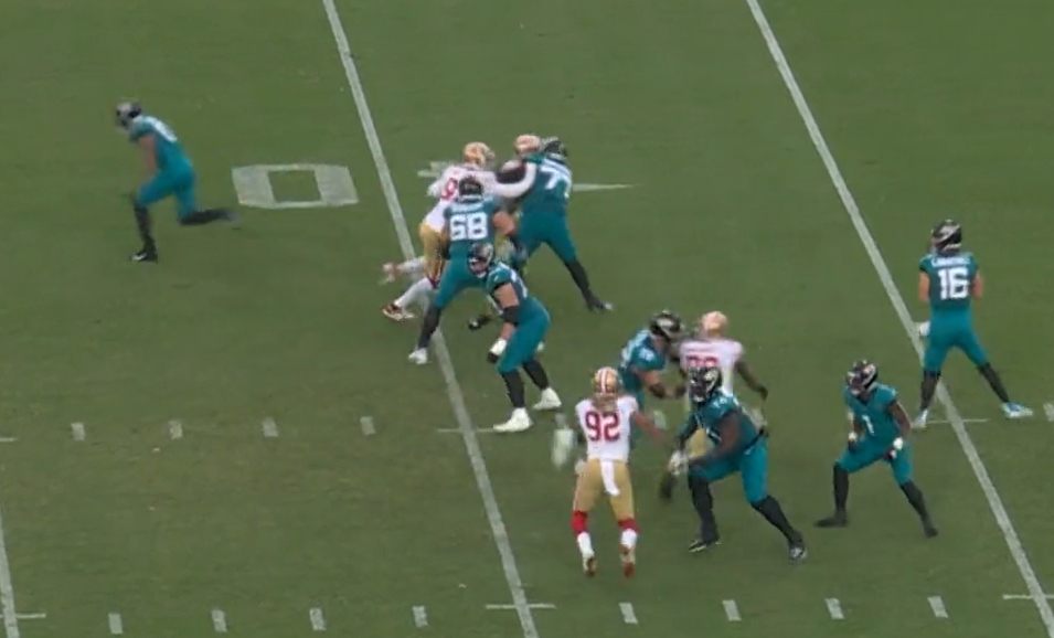 That said, however, the Cowboys and the 49ers established themselves with blowout victories on Sunday. San Fran destroyed the Jaguars 34-3 after Jacksonville had gone on a five-game winning streak. The 49ers won convincingly on the road after a three-game skid on plays like these: